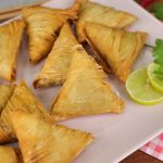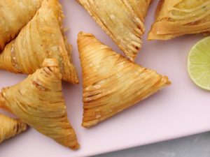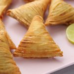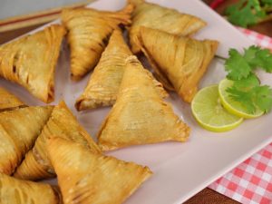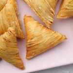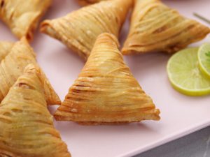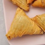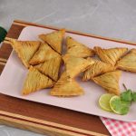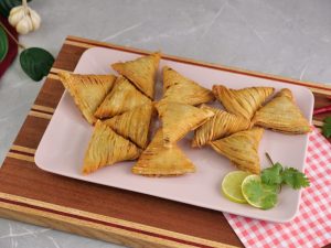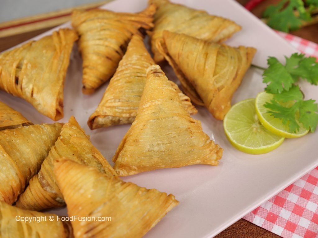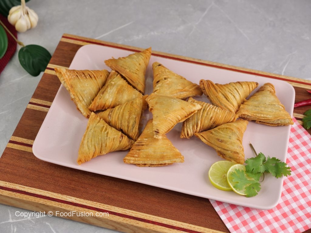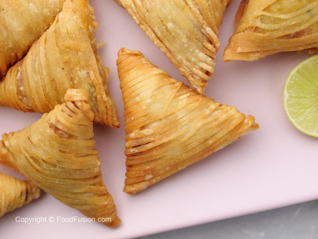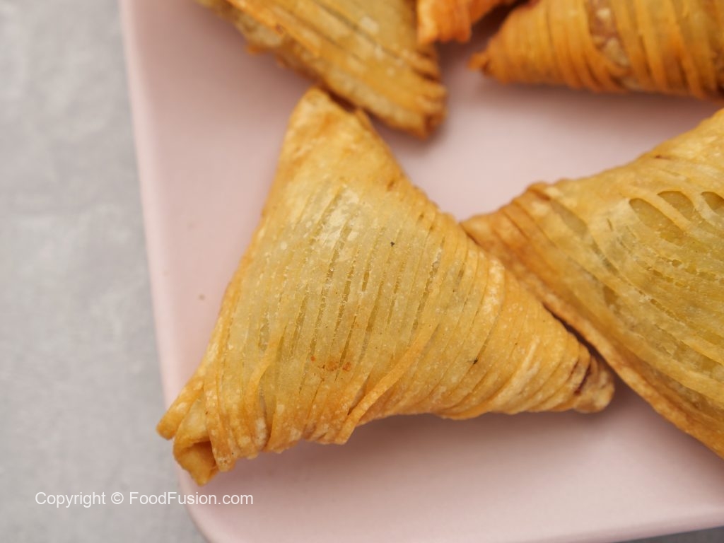-Apply flour slurry,make a pocket,add prepared filling in the center & fold into the shape of samosa & seal corners with flour slurry (makes 20-24).