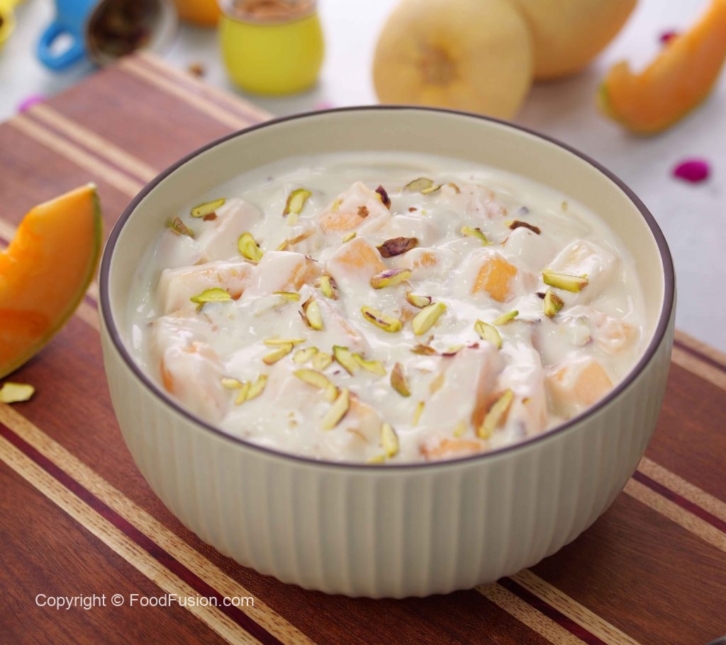 -Muskmelon ki tip ko cut karein aur seeds nikal ker cubes mein cut ker lein.