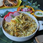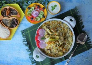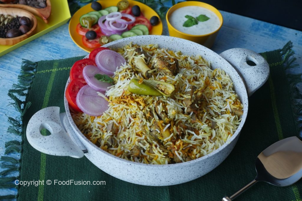 In a pot,add half quantity of boiled rice,prepared mutton qorma,khoya,fried onion,spiced yogurt,green chillies,remaining boiled rice,cover & steam cook on low flame for 18-20 minutes.