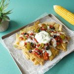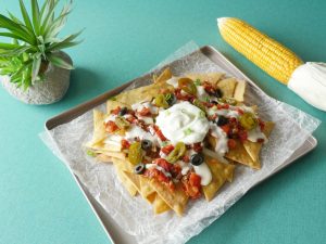 Top nachos with salsa,cheese sauce,jalapenos,black olives,green onion leaves,sour cream & serve!