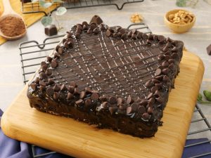 -Remove cake from cake pan,drizzle remaining chocolate ganache,chocolate chips & serve!