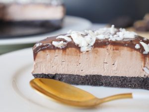 Ab tayar chocolate cheese mixture ko biscuit ki crest layer pe daal kar level karen.