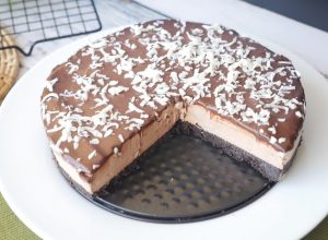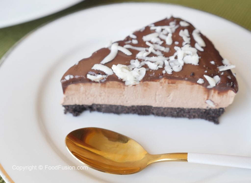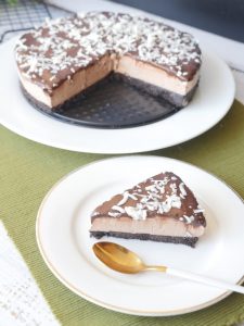 Add the prepared chocolate cheese mixture on the biscuit crust layer in pan and level with spatula.