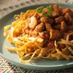 -On a serving plate,add prepared egg noodles,marinara sauce,cooked chicken & serve!
