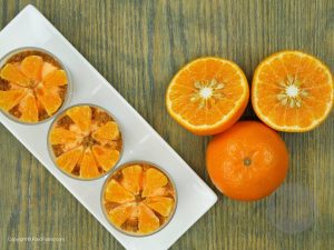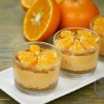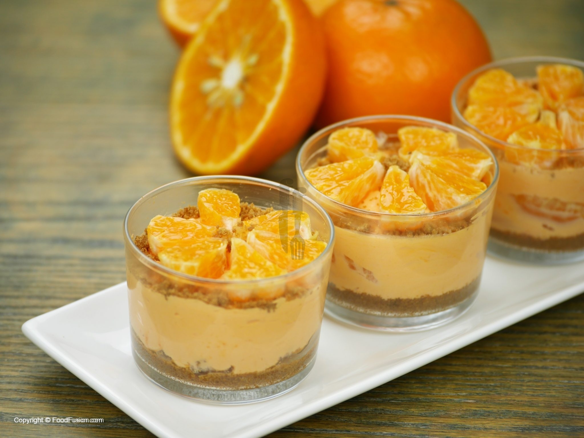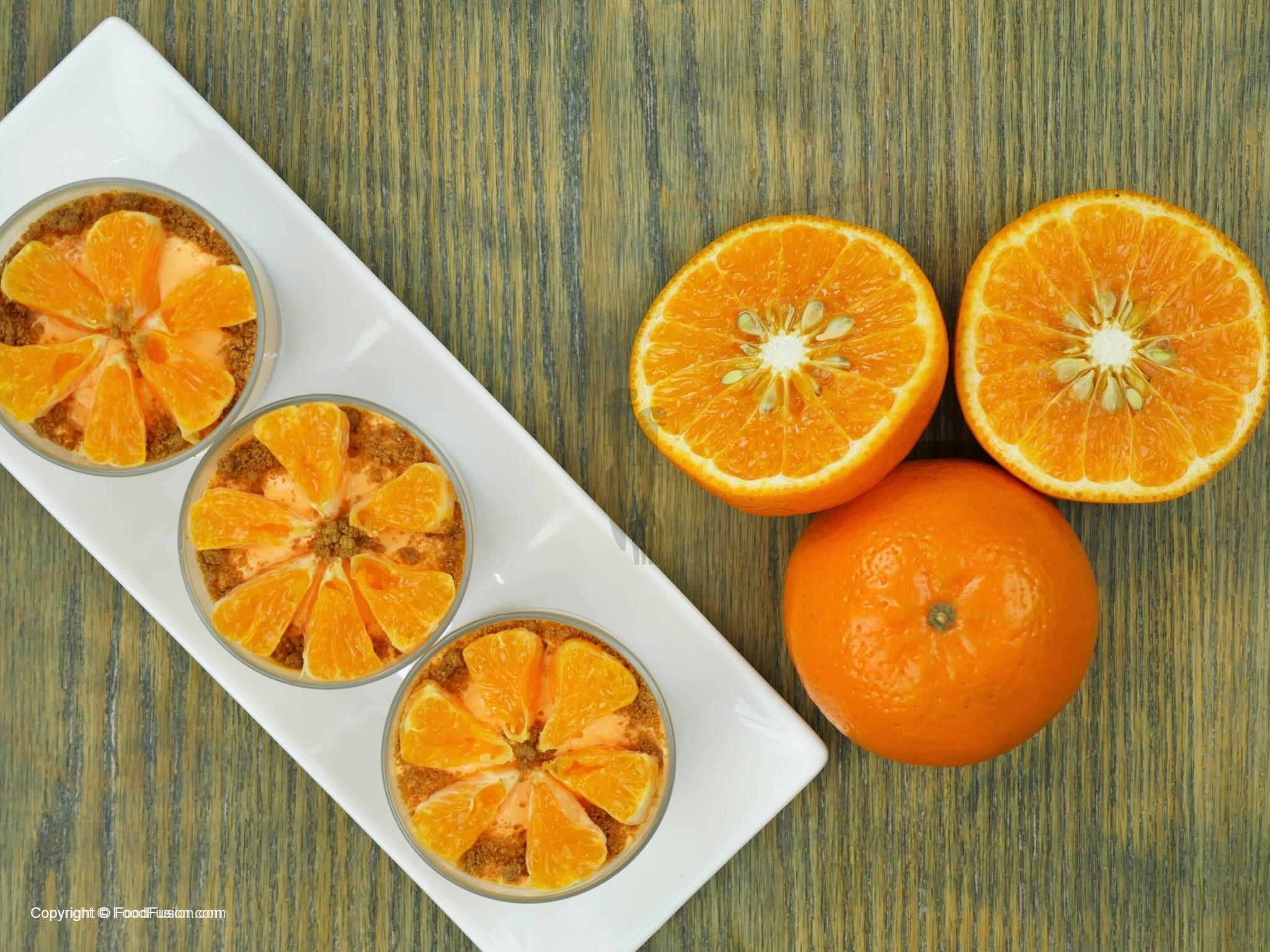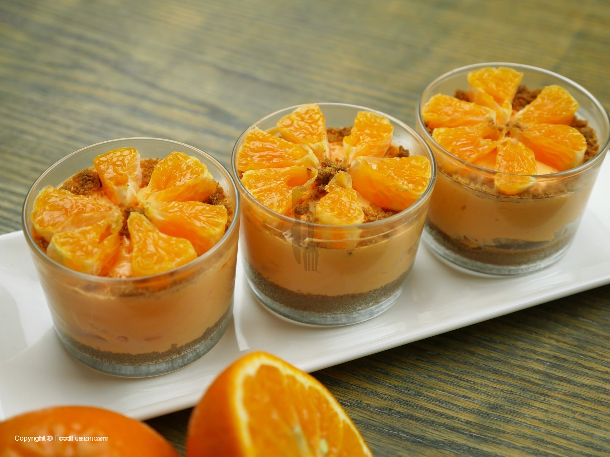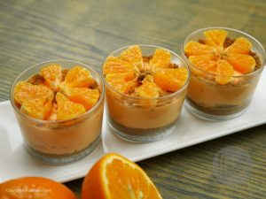Biscuit crumbs aur oranges slices sa garnish karein.