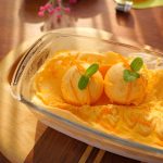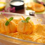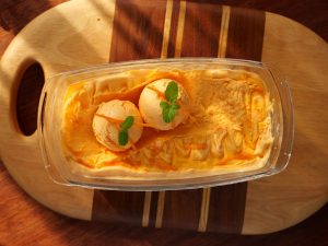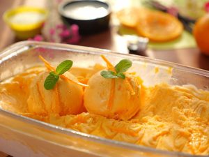 -Pour in a loaf pan, add orange syrup (Cook ½ cup orange juice with ½ cup sugar until thickened. Once cooled, your syrup is ready to use) & orange garnish, cover & freeze for 8-10 hours or overnight.