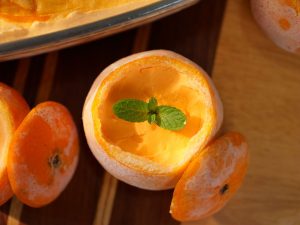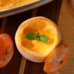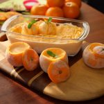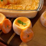 -Cut the top of the orange, place the strainer in a bowl, remove its pulp to create a clean vessel & squeeze out its juice.