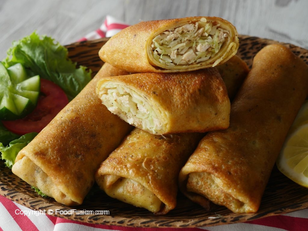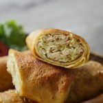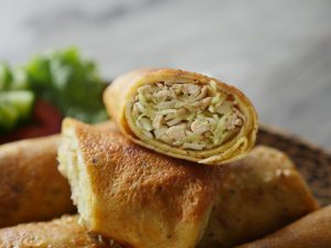 Take a prepared wrap,add chicken & cabbage filling,fold over the sides,roll up and apply all-purpose flour paste.