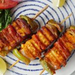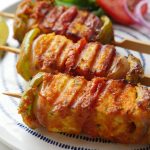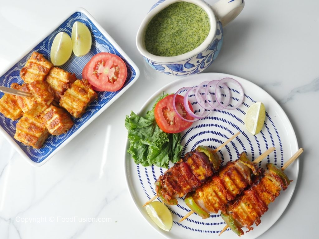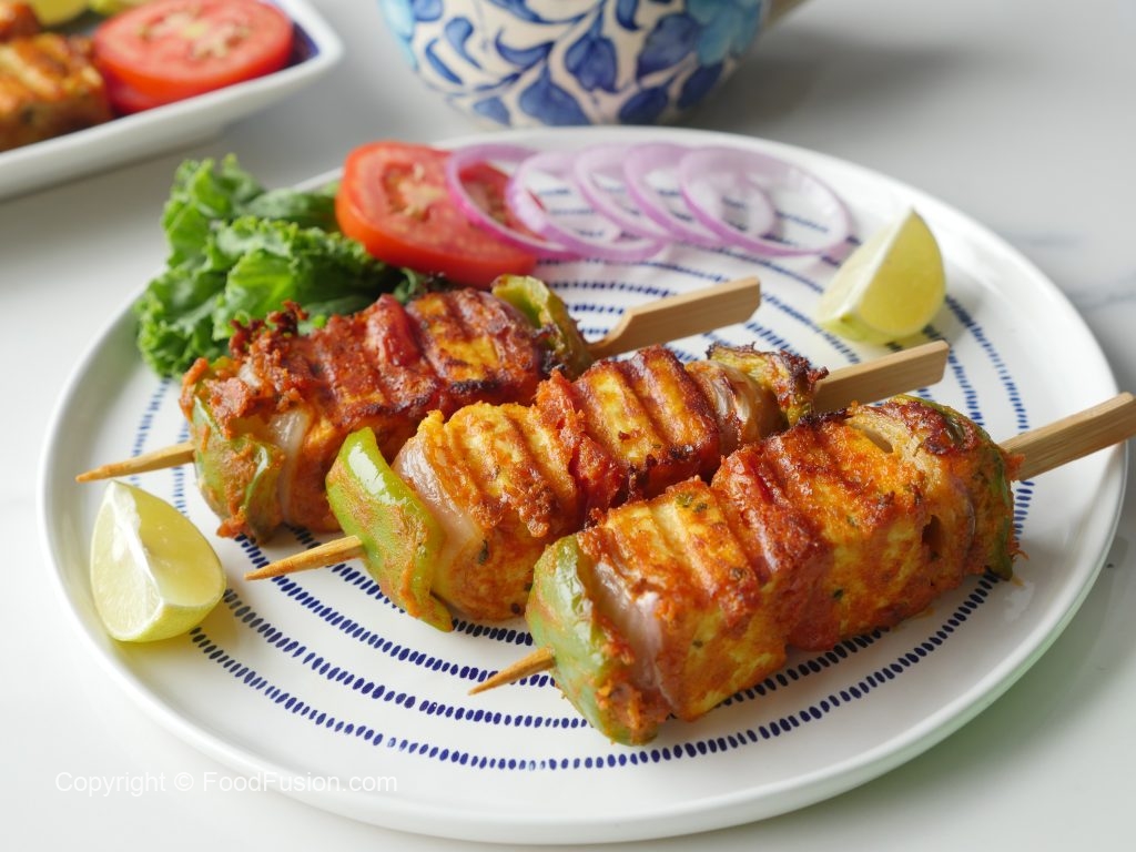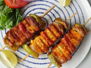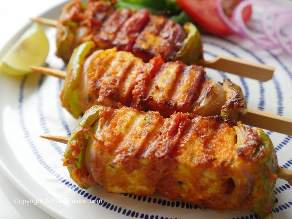 Paneer cubes aur vegetables ko skewers per laga lein (makes 10-12).
