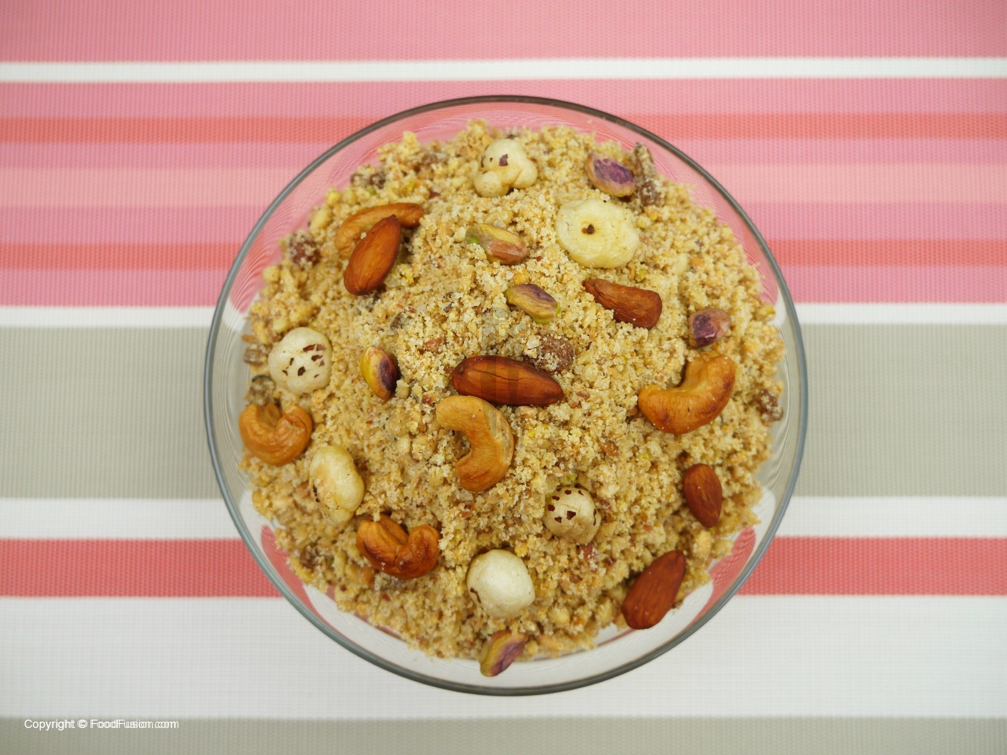 Bowl mein sooji mixture,coarsely ground fried nuts,char magaz & kishmish aur pisi huee cheeni dal ker ache tarhan mix ker lein.