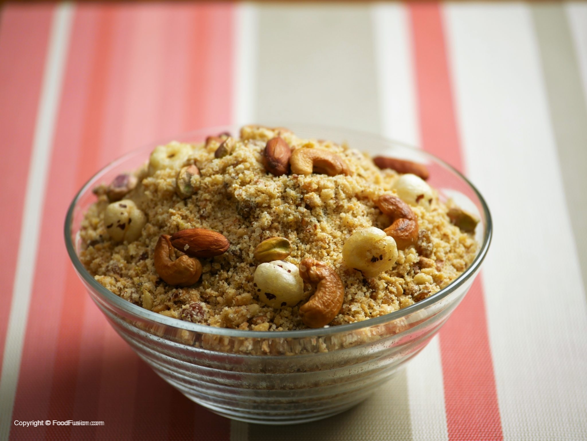 In food chopper,add all fried nuts and coarsely chop fried nuts,set aside.