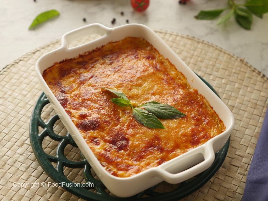 Baking dish mein tayyar tomato sauce,fried baingan slices,tayyar tomato sauce,mozzarella cheese, parmesan cheese,fresh basil leaves,fried baingan slices,prepared tomato sauce,mozzarella cheese aur parmesan cheese dal dein.