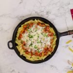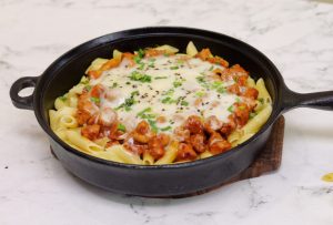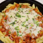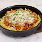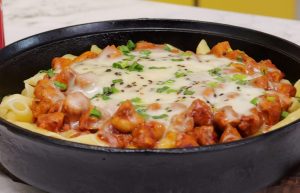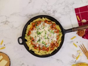 Cast iron pan mein penne pasta,cooked chicken,mozzarella cheese,hara pyaz aur black & white til ker dhak dein aur halki ancch per cheese melt ho janay tak paka lein (4-5 minutes).