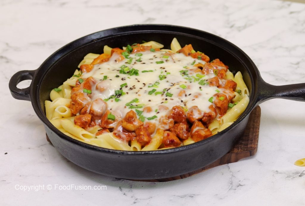 In a cast iron pan,add penne pasta,cooked chicken,mozzarella cheese,spring onion leaves,black & white sesame seeds,cover & cook on low flame until cheese melts (4-5 minutes).