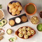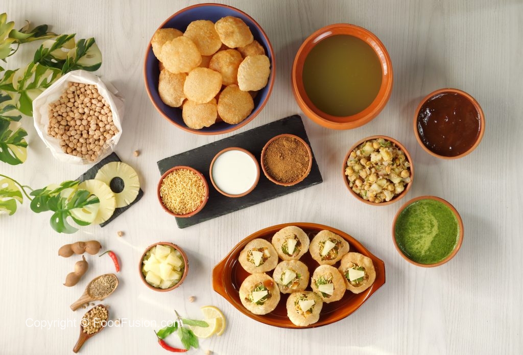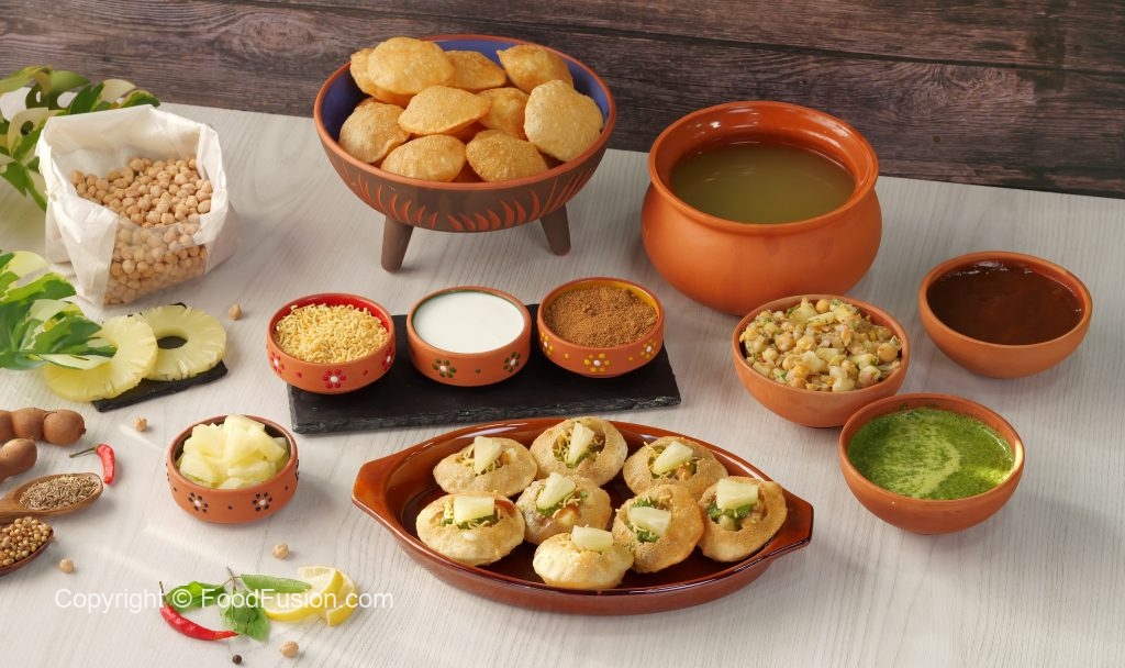 -Poke gol gappay from the center,add prepared aloo chana filling,prepared imli ki khatti meethi chutney,green chutney,pineapple chunks,nimco sev,prepared sweet & spicy pineapple pani & serve!