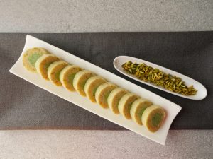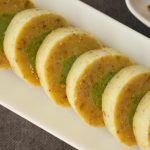 Take green color part and roll it little tightly and place it over the white part and roll it like swiss roll.