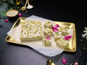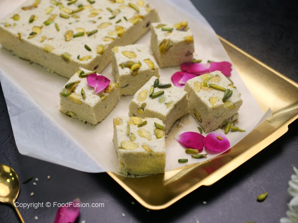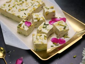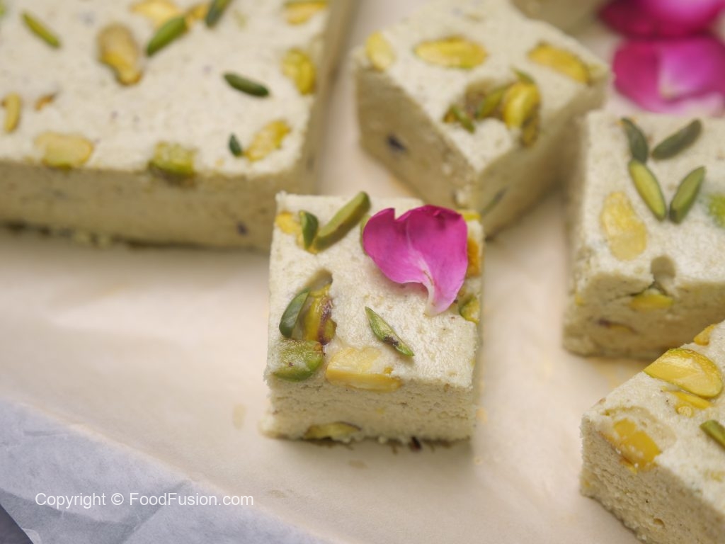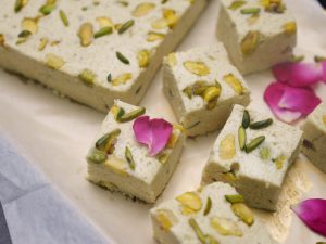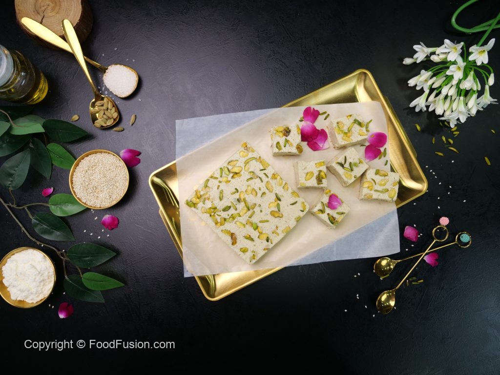 -Mold ko cooking oil sa grease karein (lined with cling film),pista aur til ka mixture dal ker evenly pheela lein aur bech mein pista dal dein aur set ho janay tak 2-3 hours kliya refrigerate ker lein.