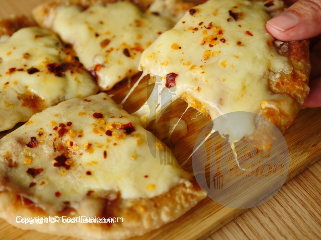 Add cheddar cheese,mozzarella cheese,pizza sauce,garlic powder,red chili crushed,dried parsley,salt and mix well,set aside.