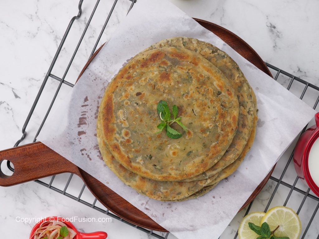 On heated griddle,place paratha,add ghee & fry paratha from both sides until done (makes 6).