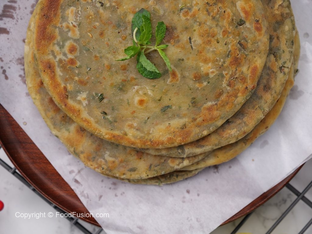 Add & spread ghee & sprinkle prepared mint spice mix.