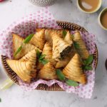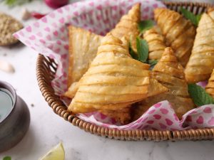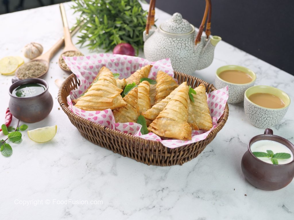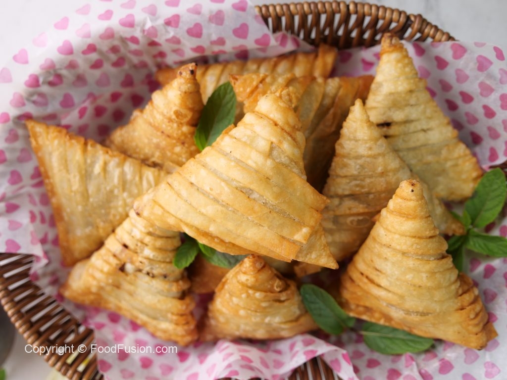 -Apply flour slurry,make a pocket,add mince filling in the centre & roll into the shape of samosa and seal corners with all-purpose flour slurry (makes 12-14).