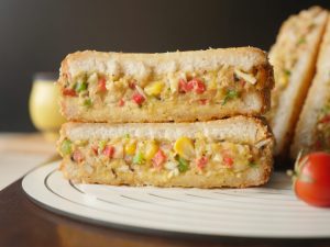 Pyaz,shimla mirch,gajar,corn kernels,chicken sausages,fresh parsley,namak,kali mirch crushed,zeera, lehsan powder,chicken powder,paprika powder,kalay til,safed til aur mayonnaise dal ker ache tarhan mix ker lein.