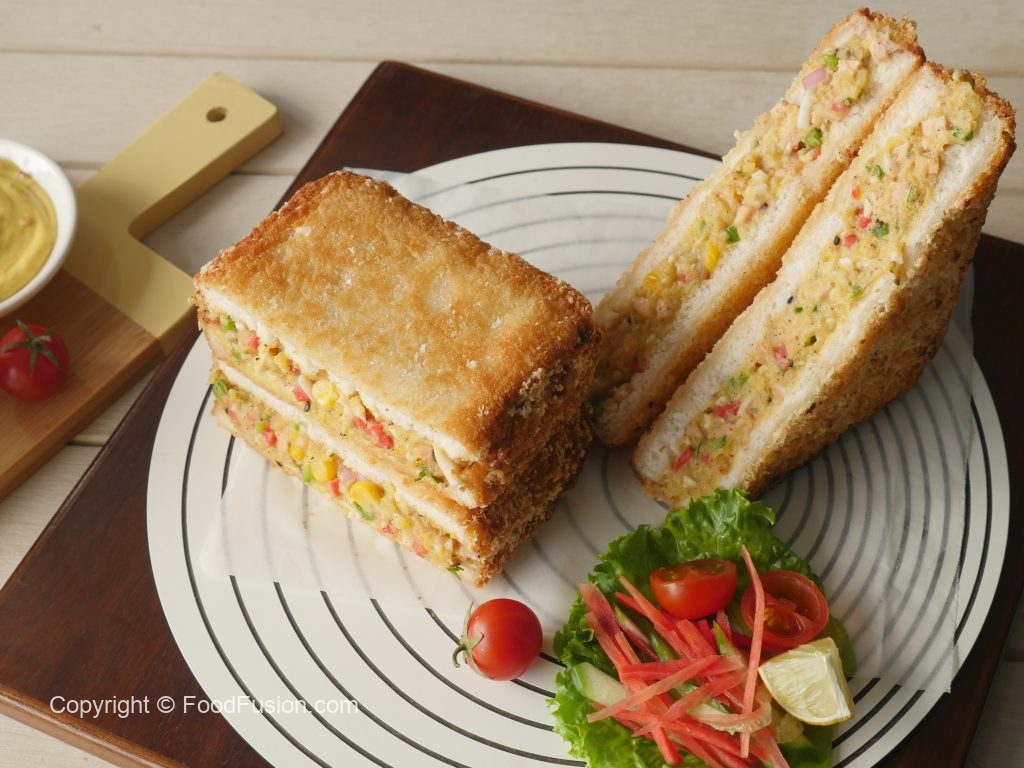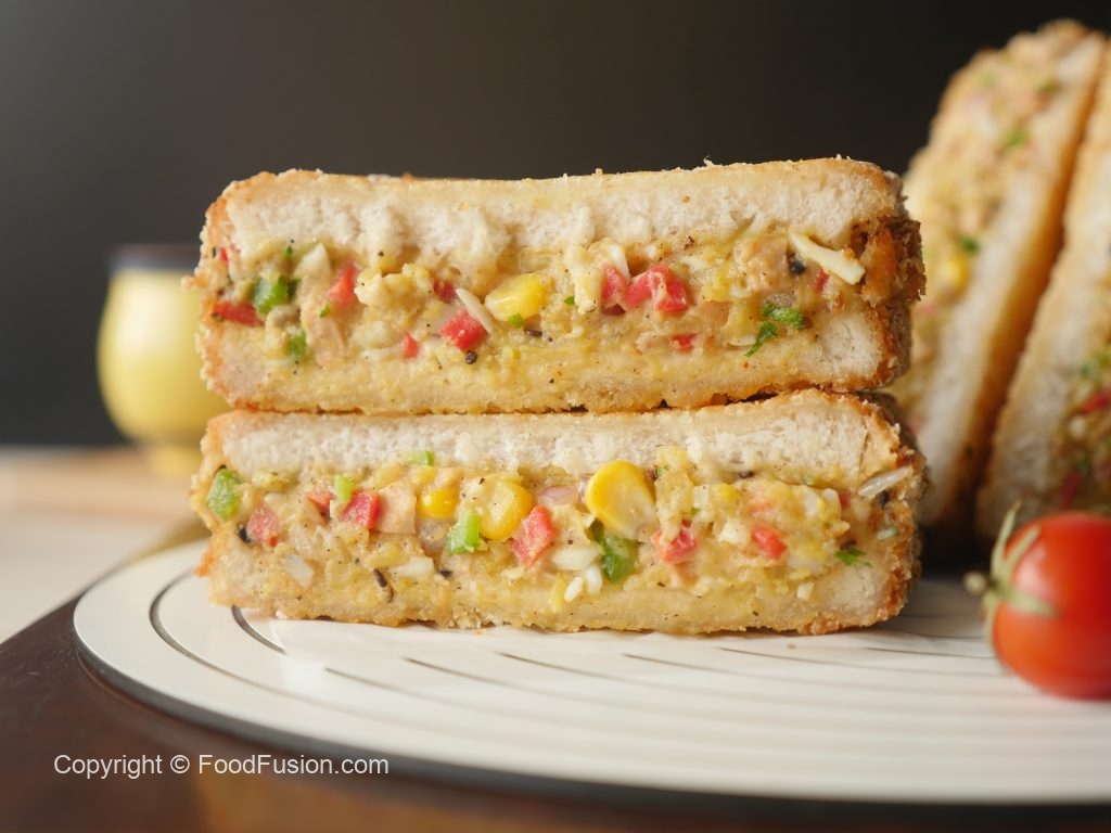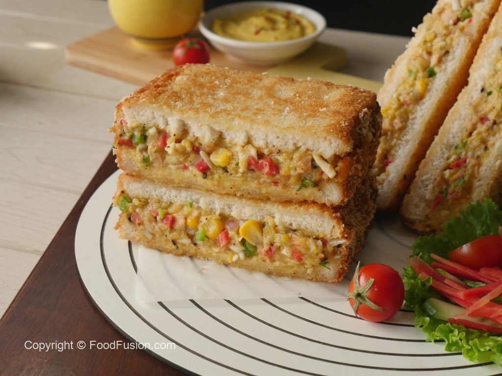 On a bread slice,place prepared ball & spread mixture evenly and place another bread slice over it then dip into prepared flour slurry & coat with breadcrumbs & shape the sandwich properly (makes 7-8).