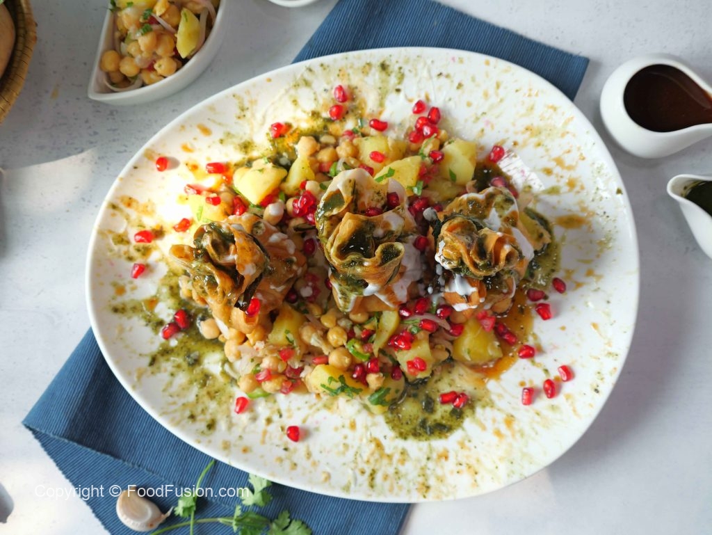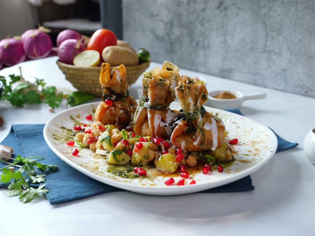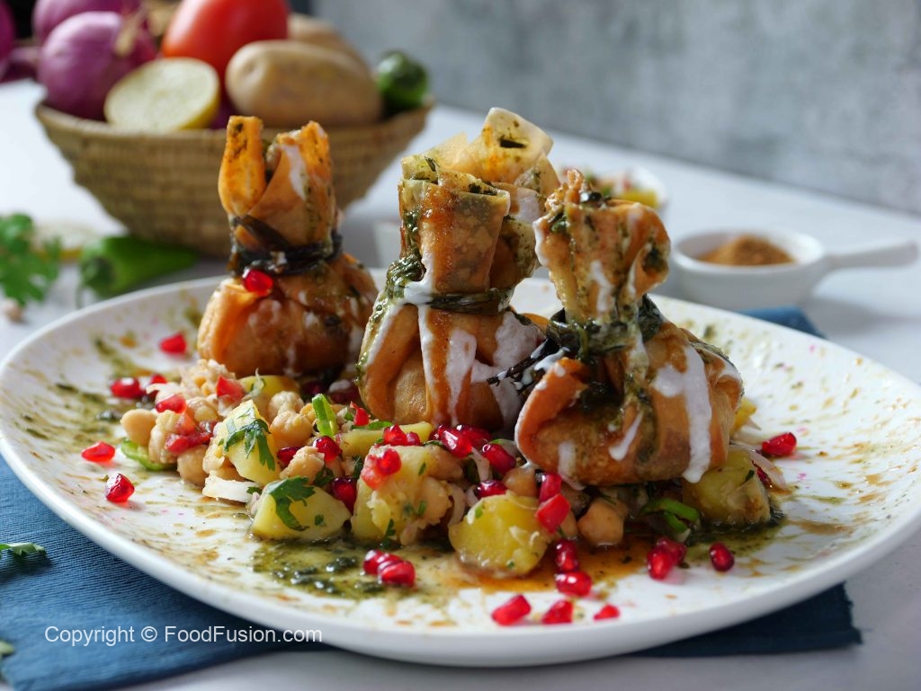 -Upar se chana mix,potli samosa,rakh kar phir se yogurt,tamarind chutney,green chutney,pomegranate daal kar serve karein.