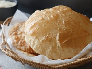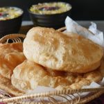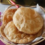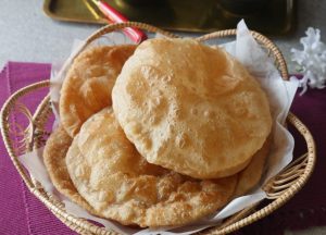 Grease working surface with oil & roll out dough with the help of rolling pin then press & spread gently with hands (makes 12 puris).