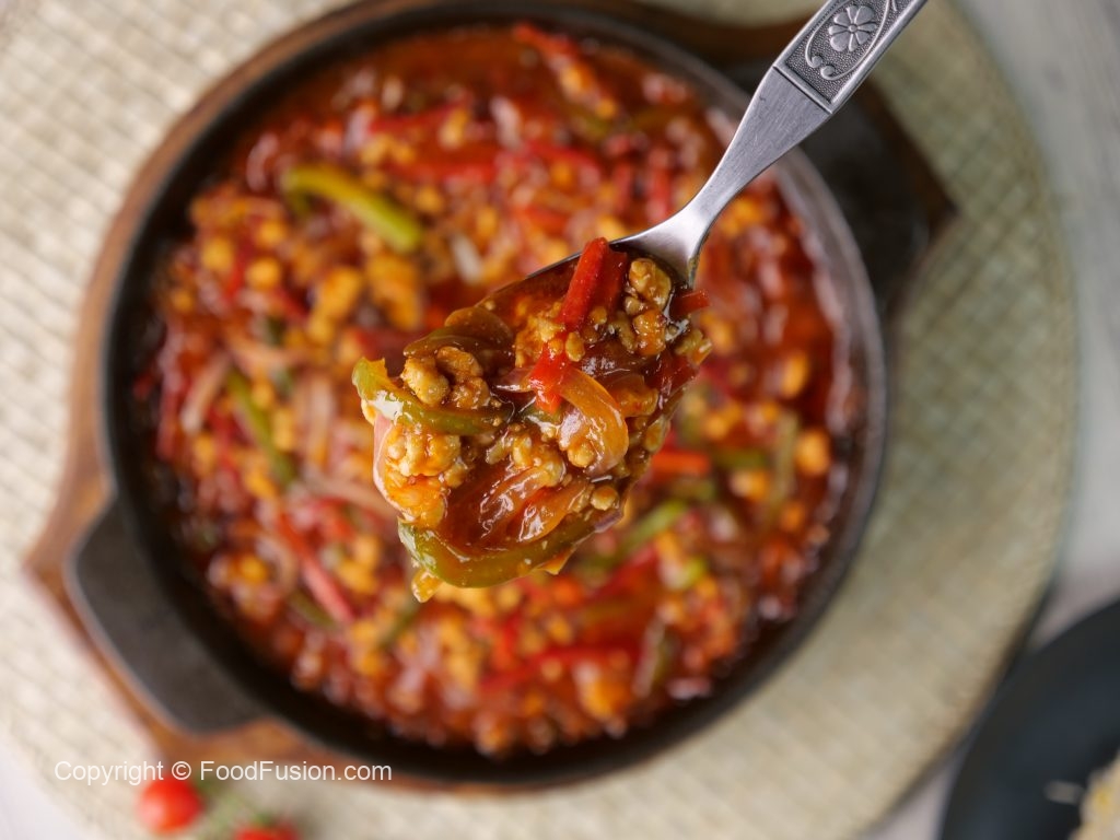 -Sizzler pan ko garam karein aur qeema manchurian dal ker fried rice ka saath serve karein!