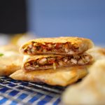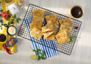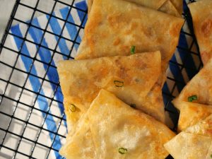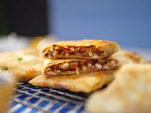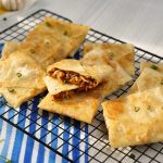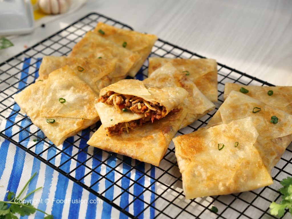-On roll sheet,add prepared filling (2 tbs),apply flour slurry & fold to make a parcel shape (makes 14).