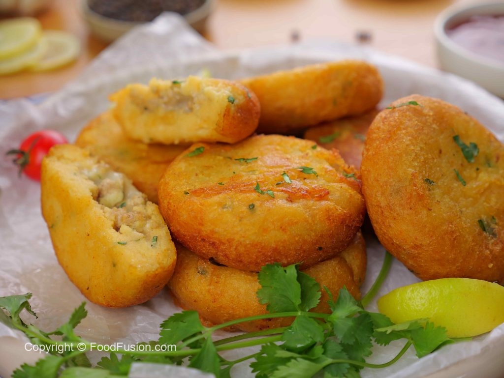 -On a cutting board, place cling wrap, add 80g of potato mixture, flatten it with your hands, stuff 20g qeema mixture & make a patty (Makes 7-8).