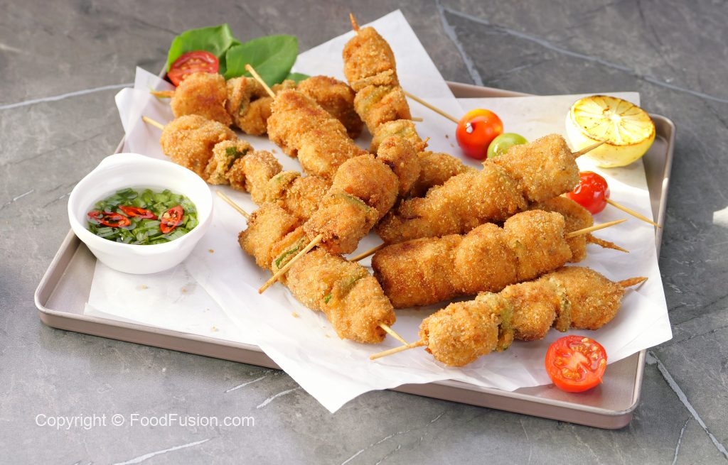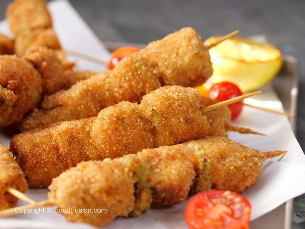 -In a wok,heat cooking oil & fry chicken skewers on low flame until golden & crispy.