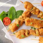 -Coat chicken skewers in all-purpose flour then dip in whisked eggs & coat with breadcrumbs (makes 14-15).