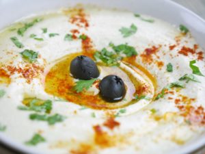 Now dish out hummus, make well with a spoon and drizzle olive oil and paprika. Add 1-2 black or green olive for garnish.