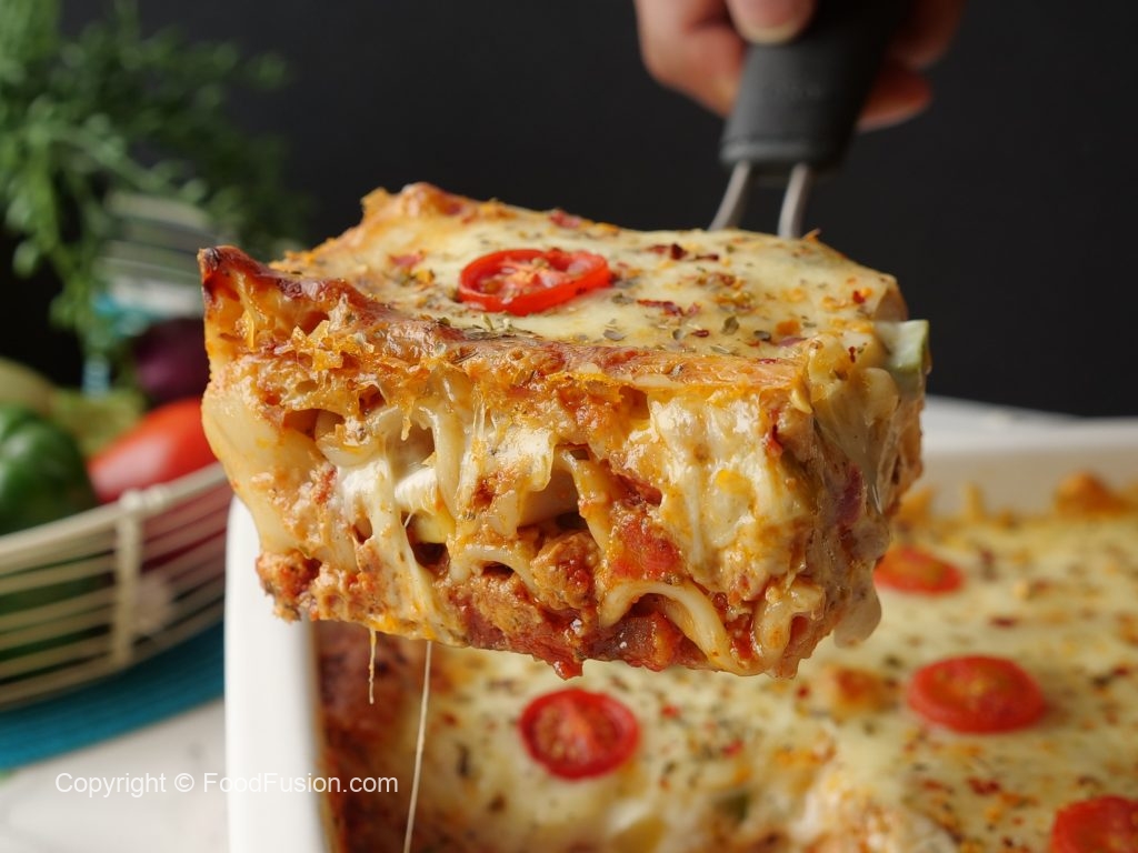 -In 10 x 6 inch baking dish,add & spread prepared red sauce,lasagna sheets,red sauce,prepared vegetable white sauce,mozzarella cheese,cheddar cheese,lasagna sheets,red sauce,vegetable white sauce,mozzarella cheese,cheddar cheese,lasagna sheets,red sauce,vegetable white sauce,mozzarella cheese,cheddar cheese,sprinkle red chilli crushed,dried oregano & garnish with cherry tomatoes.