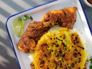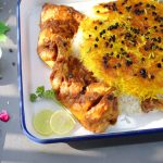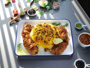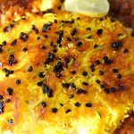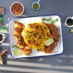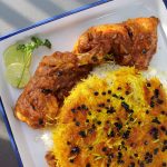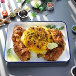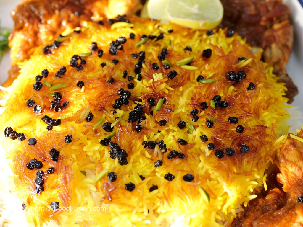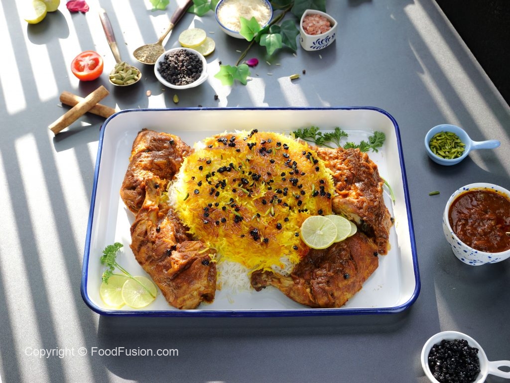 -Flip pot on large tray,placing the crispy part on the top,add chicken pieces with gravy,glazed barberry,pistachios & serve!