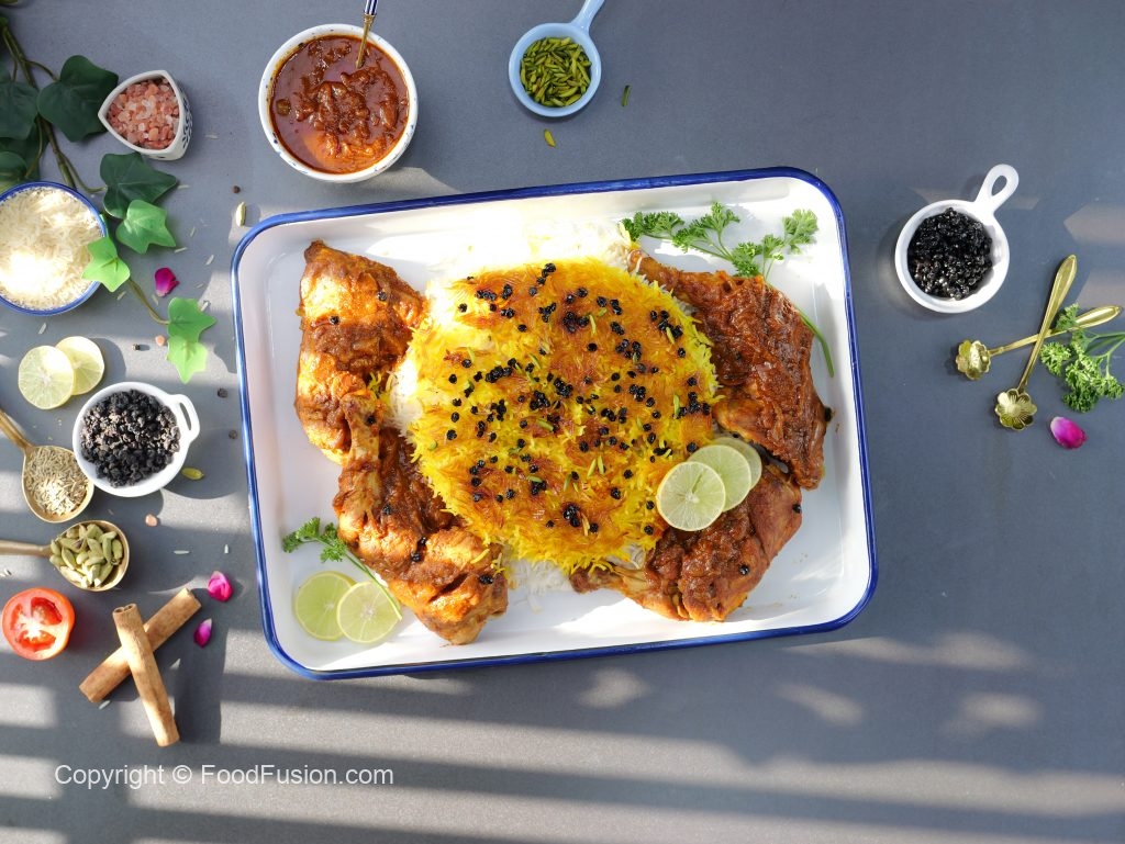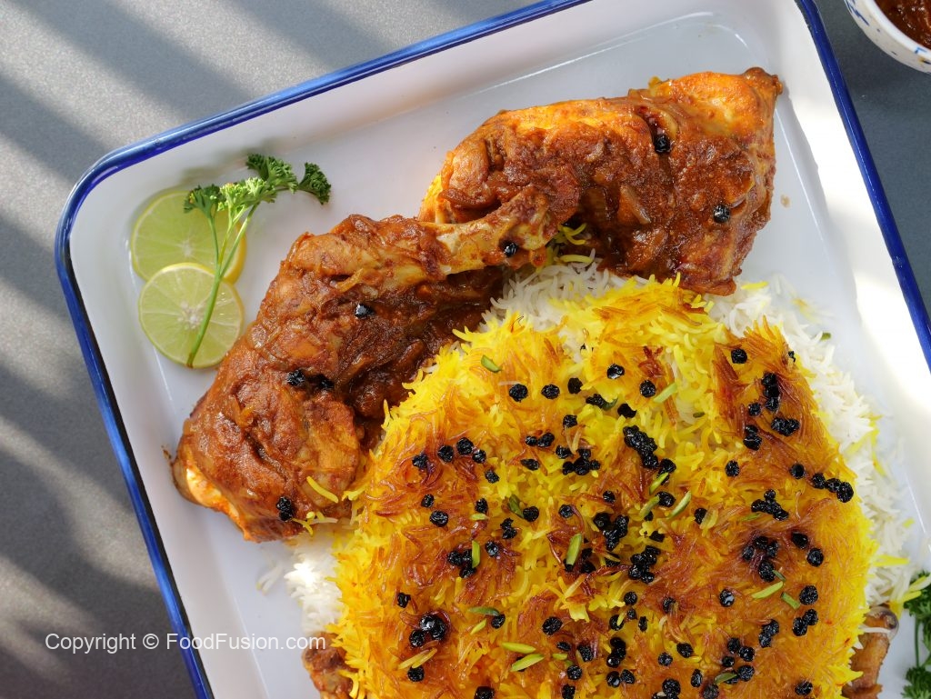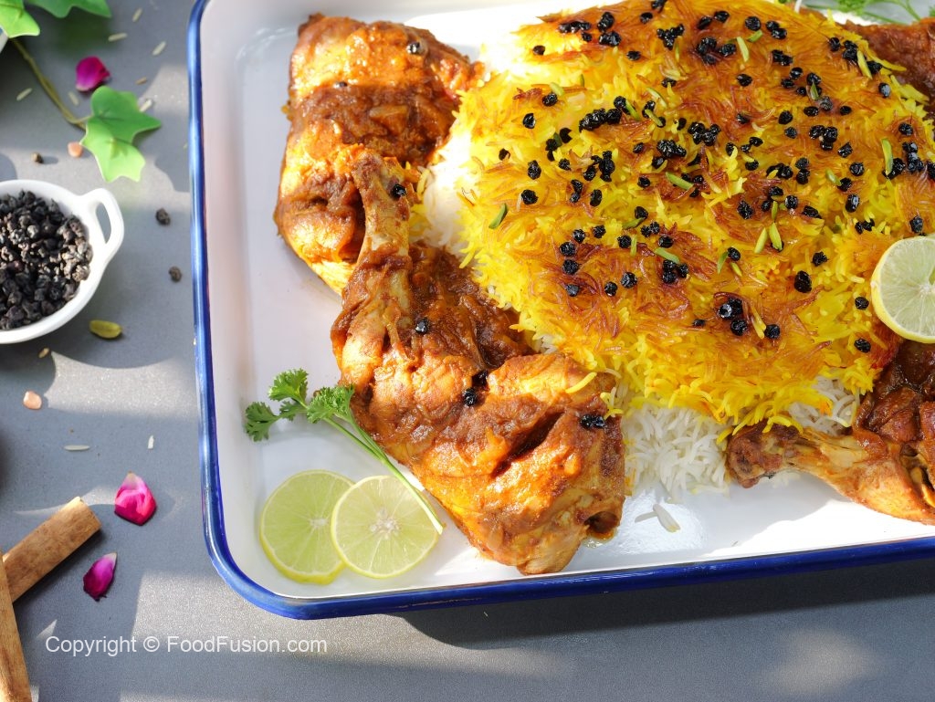 -Pot ko large tray per flip karein,chicken pieces,gravy aur glazed barberries dal dein aur pista dal ker serve karein!