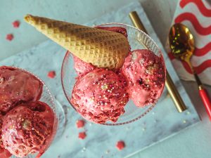 Make swirls gently with the help of skewer,cover the surface of ice cream with butter paper then cover with lid and freeze for 8 hours to overnight (yields: 2.5 litres).