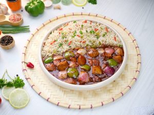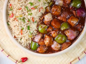 -Spicy Schezwan chicken gravy ko fried rice ka saath serve karein.