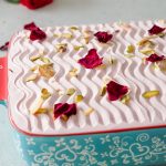 Takeout from the refrigerator, apply rose frosting & garnish with pistachio, almonds, and dried rose petals.