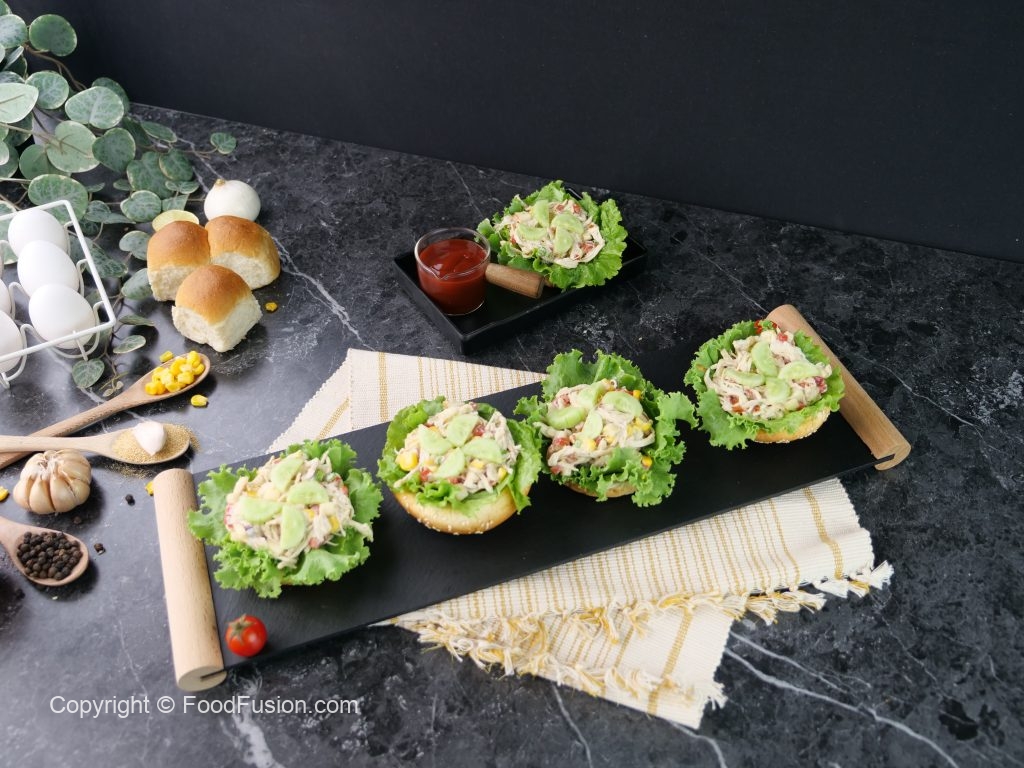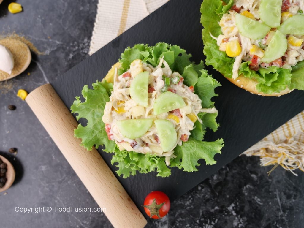 -Air fried/toasted burger bun mein salad patta rakh ker tayyar chicken salad dal dein aur kheera sa garnish ker ka serve karein! (Serves 6-8)