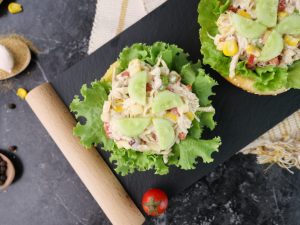 -Bowl mein boiled & shredded chicken,mayonnaise,kali mirch powder,lehsan powder,namak,gajar, cron kernels,celery stalk,saib aur badam dal ker ache tarhan mix ker lein.