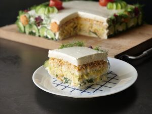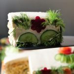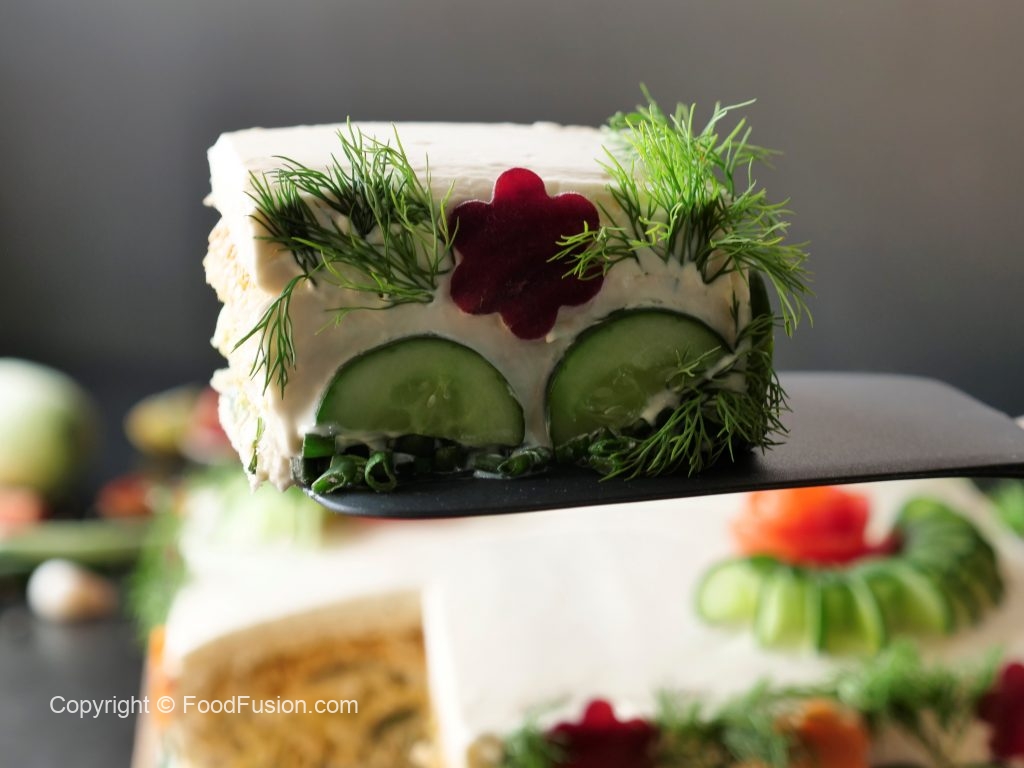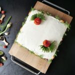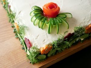 Decorate sides & top with green onion leaves,dill,cucumber,carrot,beetroot & tomato.