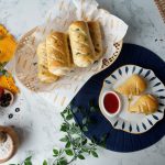 Rolled dough ki edges per pani laga lein aur dough ki sides ko fold ker ka dough ko roll ker lein aur cuts laga lein.