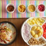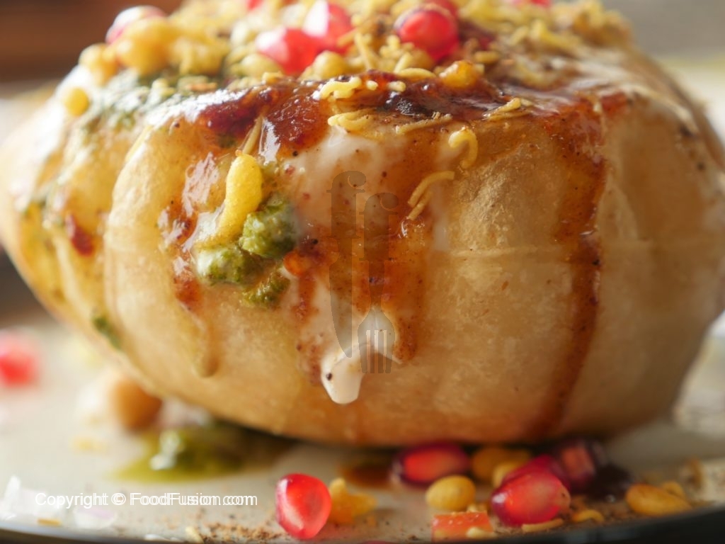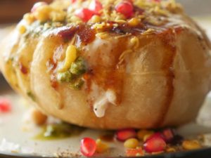 In kachori,make a hole,add chickpeas,moong daal phulkiyan,potato,tomato,onion,yogurt,meethi chutney,green chutney,red chili crushed,boondiyan,sev/papri,pomegranate,yogurt,chaat masala and sev/papri & serve.