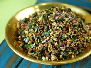 -In a large tray,add betel leaves,roasted fennel seeds,roasted dried coriander seeds,roasted almonds, roasted cashew nuts,roasted dried dates,colored desiccated coconut,betel nut,colored fennel seeds, silver mint balls,rose petal jam,cardamom powder & dried rose petals.