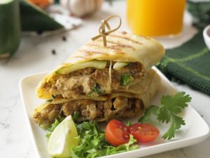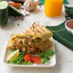 Take out crepe on a clean surface,add cabbage,cucumber,tomatoes,capsicum,prepared tahini mayo sauce (1 tbs),prepared shawarma filling,fold all sides & roll it.