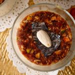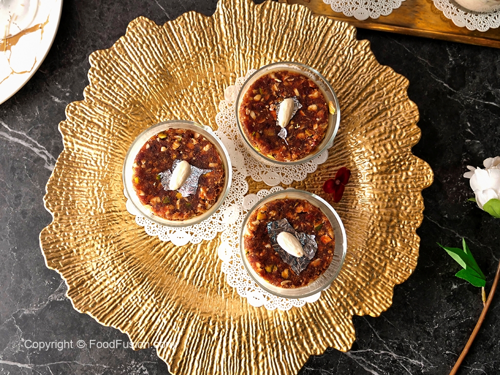 Serving glass mein tayyar sheer khurma dal ker upper sa date mousse disc rakh dein.