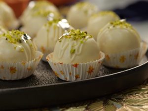 Garnish with edible silver leaf & pistachios.